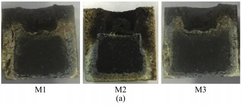 M1 is a non-composite powder, M2 is a composite powder prepared by mechanical methods, and M3 is a composite powder prepared by combustion methods. The results show that, compared with the sample without composite powder, the sample containing nano-carbon black composite powder exhibits stronger resistance to slag erosion. This is because the nano-carbon black composite powder has a large specific surface area, promoting sintering densification and improving the bonding strength of the sample, thus resisting the penetration of high-temperature slag.